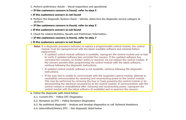 As Over-the-Air (OTA) updates and Vehicle-Wide-Programming become more commonplace on GM vehicles, a new diagnostic strategy is being implemented to better address performance concerns related to control module updates and replacements. Based on the latest data from the service engineering teams, the new strategy directs technicians to reprogram a control module with the latest software using SPS before replacing the module in all GM vehicles. (Fig. 1) If the updated software corrects the issue, no further repairs, including module replacement, are needed.