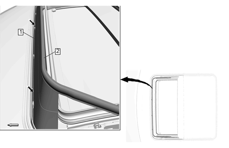Replace the clips by opening the sunroof to the fully open position. Push the sunroof air deflector (Fig. 2, #2) down and back using a suitable tool to release it from the sunroof housing assembly clips. (Fig. 2, #1) Pull the air deflector up and back to remove it. If the clips are broken, be sure to remove all pieces.