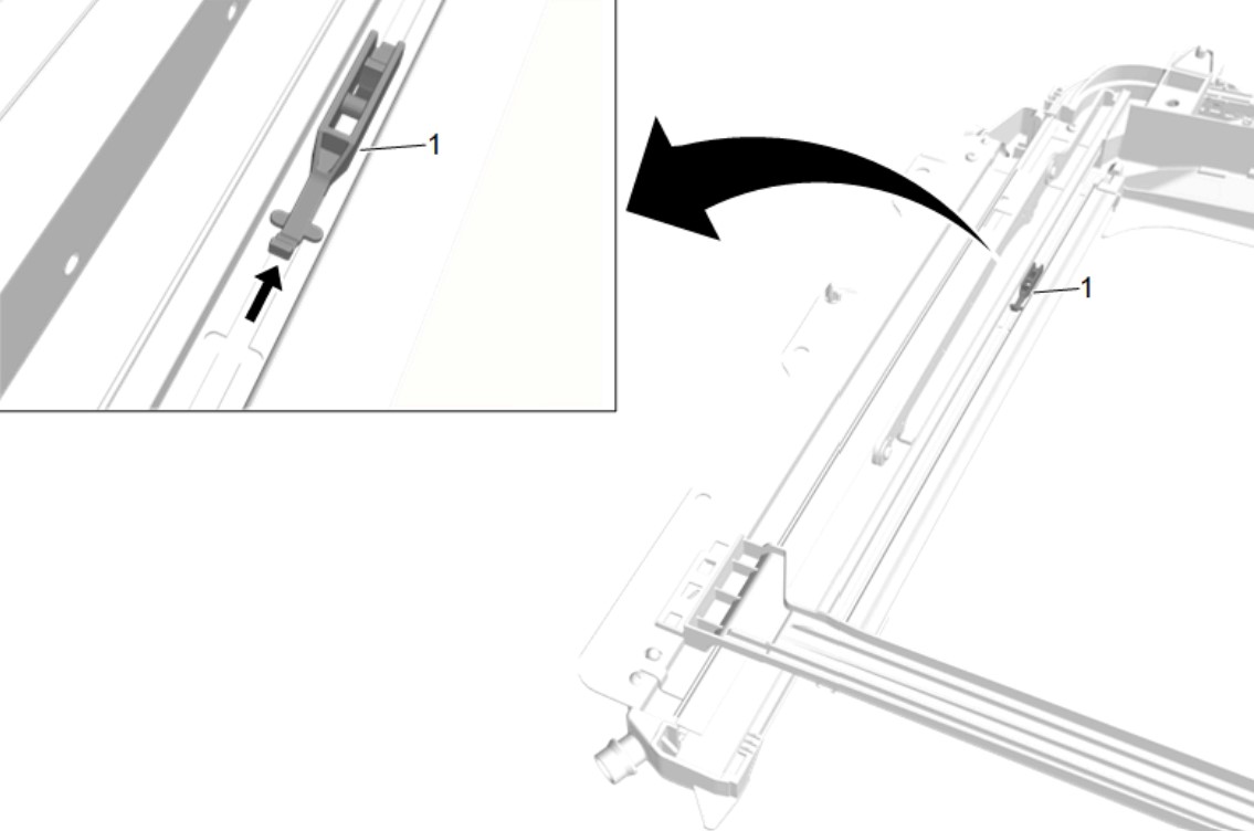 Place the new sunroof air deflector clips (Fig. 3, #1) into the sunroof housing rails. Gently slide each clip back until the wings of the clip are fully seated into the rail cutouts. Very little downward force is needed. Complete repairs by reinstalling the air deflector and verifying proper sunroof operation.