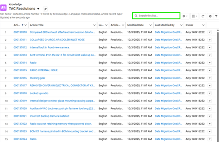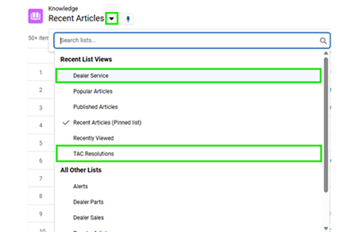 Note: You can search for resolutions in either the Dealer Service or TAC Resolutions list view.