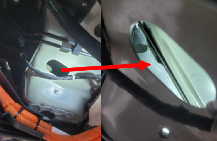 Next, from under the vehicle, remove the underbody panel and drive unit. Locate the body hole on the passenger’s side of the frame in front of the high-voltage connectors and battery pack. (Fig. 4)