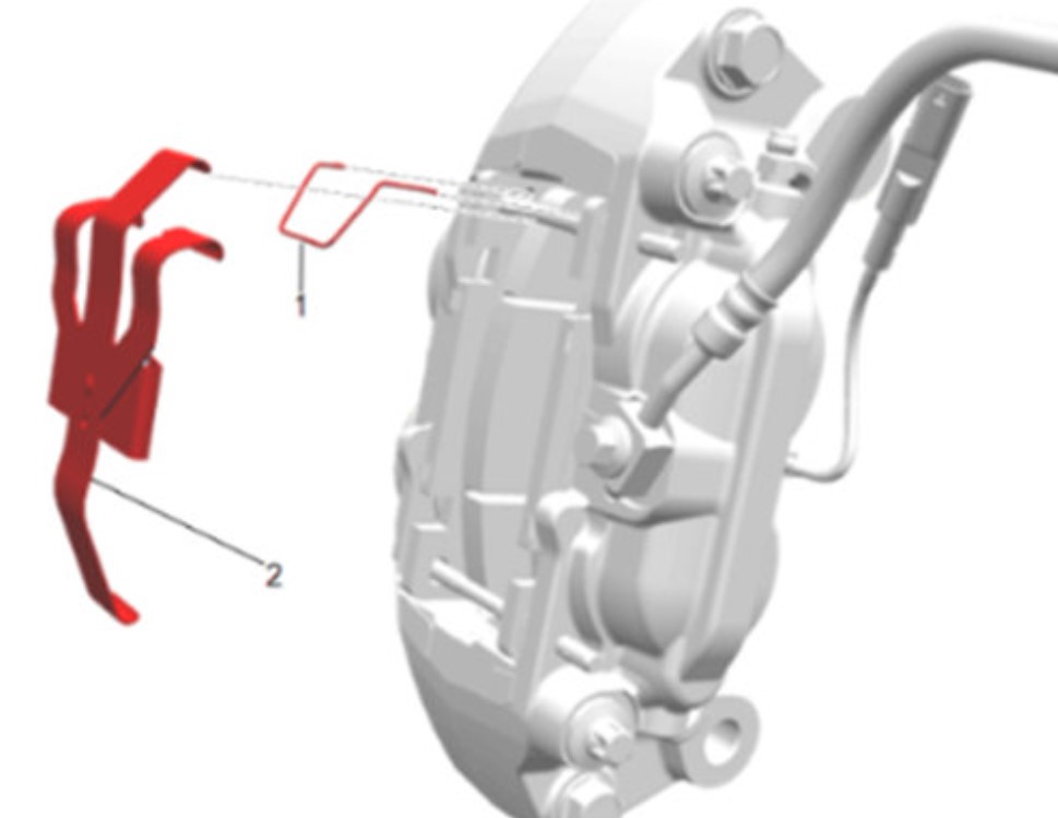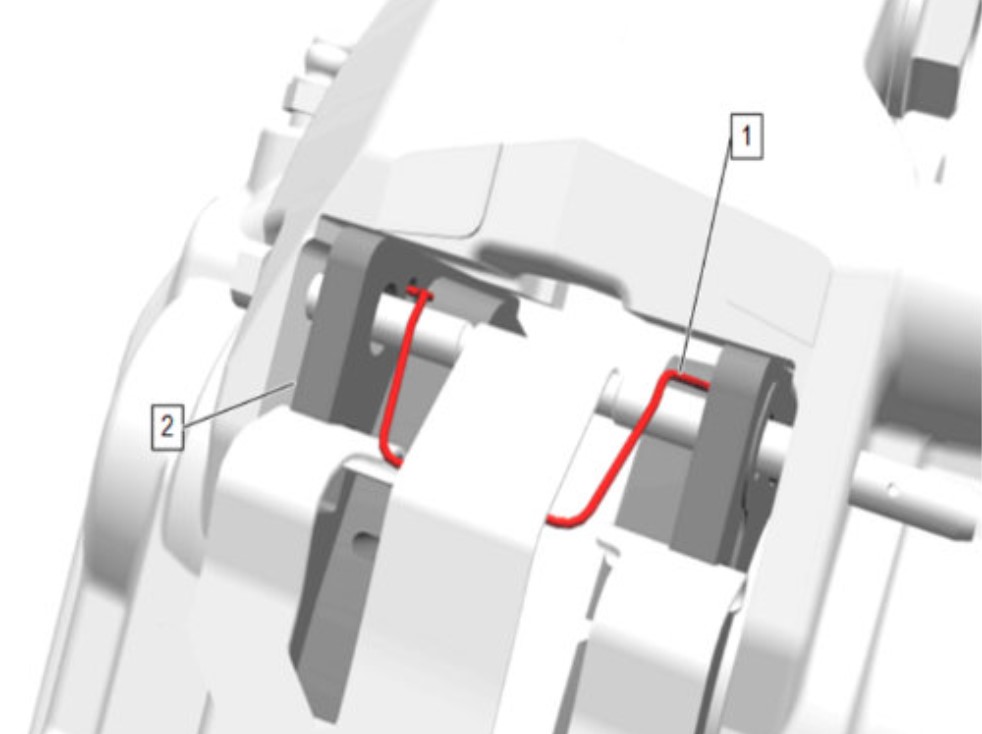 Ensure that the front brake caliper spring and front disc brake pad retainer spring are positioned correctly when installing the new brake pads. Install the front disc brake pad retaining spring with the three-tab side first. (Fig. 8. 1. Front brake caliper spring; 2. Front disc brake pad retaining spring)