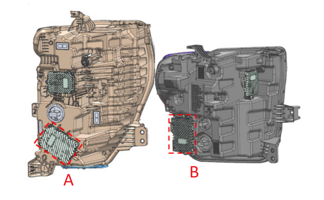 The intermittent operation of the front lighting may be due to an internal failure of the Multi-purpose LED Driver (MLD), which controls the lighting functions of the lamp assembly. (Fig. 2: A. MLD on the Chevrolet assembly. B. MLD on the GMC assembly). If the MLD has failed, it must be replaced.