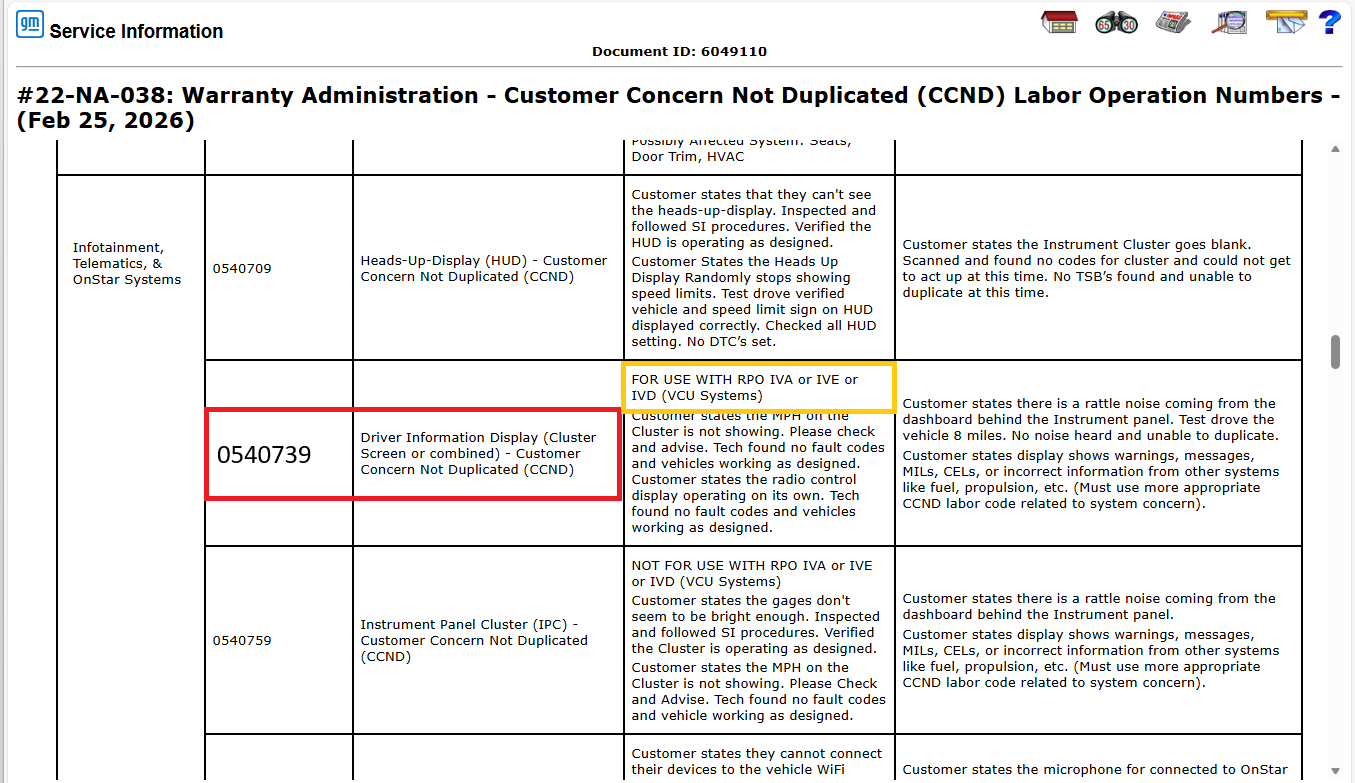 In the Infotainment, Telematics & OnStar systems group, the bulletin outlines a number of updates that include labor operations that were being used inconsistently or inappropriately for multiple conditions.