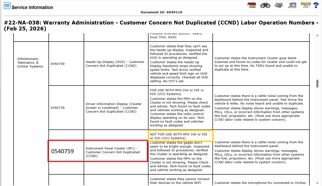 CCND Labor Operation 0540759 (Instrument Panel Cluster (IPC) – Customer Concern Not Duplicated) – Labor code 0540759 should be used for Instrument Panel Cluster concerns on vehicles that are not equipped with RPO IVA, IVE or IVD (center cluster screen). (Fig. 3)