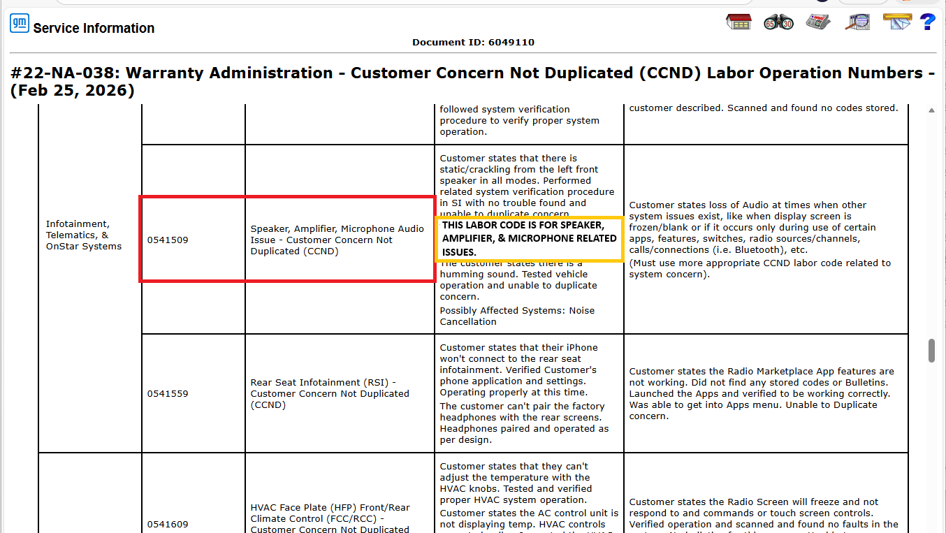 An update to Bulletin #22-NA-038 has been released that covers changes for several Customer Concern Not Duplicated (CCND) labor operations that address screen conditions and audio system issues on 2022-2027 GM passenger cars and trucks (excluding Chevrolet LCF models). The updated bulletin provides a list of labor operations along with descriptions and guidelines for CCND conditions related to a variety of vehicle systems.