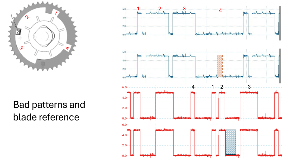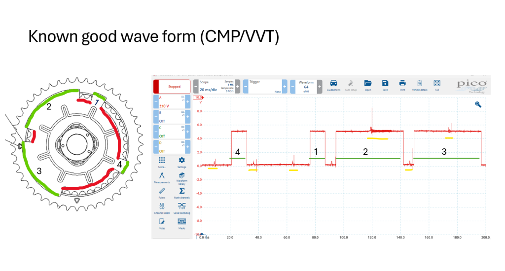 To help with diagnosis, the PicoScope can be used to evaluate the CMP sensors. The GM Technical Assistance Center (TAC) has seen an increase in sensor, circuit and ECM replacement due to DTCs P0340/341 and P0011/0016 without checking a scope pattern of the actuator interrupter ring. Comparing the wave form of a possibly damaged actuator ring with a known good wave form can speed up diagnosis due to the time and labor involved with engine disassembly as well as reduce unnecessary parts replacement.