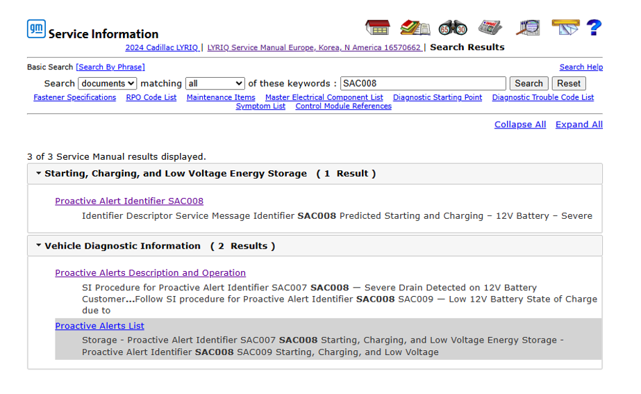 To find the Service Information procedures, search for the specific Proactive Alert Identifier, such as SAC008. (Fig. 4-5)