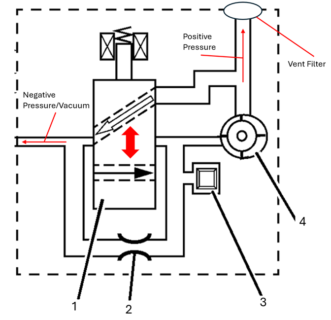 - The switching valve (#1) actuates, and the pump (#4) pulls a vacuum over the reference orifice (#2) to establish a baseline measurement.