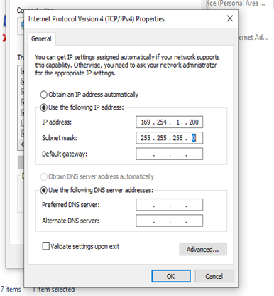 - Follow the Configuring a Static IP Link Local Address for PC Ethernet Adapter steps below to configure the PC Ethernet Adapter.